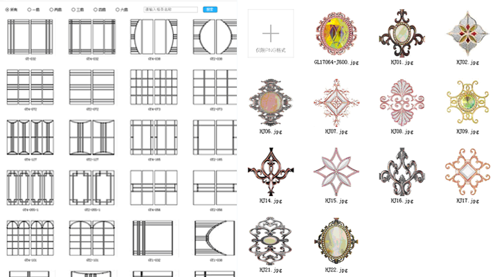 軟件自帶格條樣式,即點即用,也可自己設(shè)計格條和添加玻璃花件